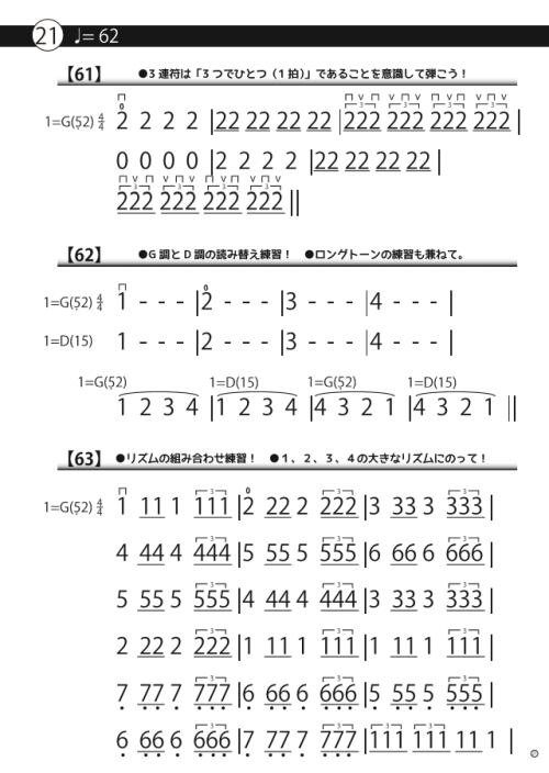G調第一ポジション編は、もちろんこれからG調に取り組む人の足掛かりとなる多数の音階練習を収録していますが、その中で3連符や複雑な運弓など、一歩進んだリズムの練習もできるようにしました。
